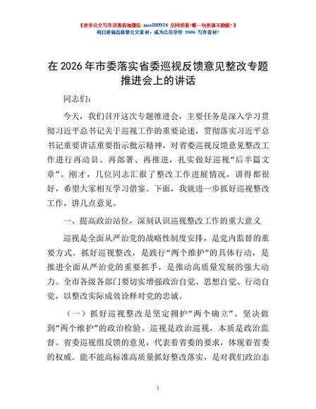 / 在2026年市委落实省委巡视反馈意见整改专题推进会上的讲话