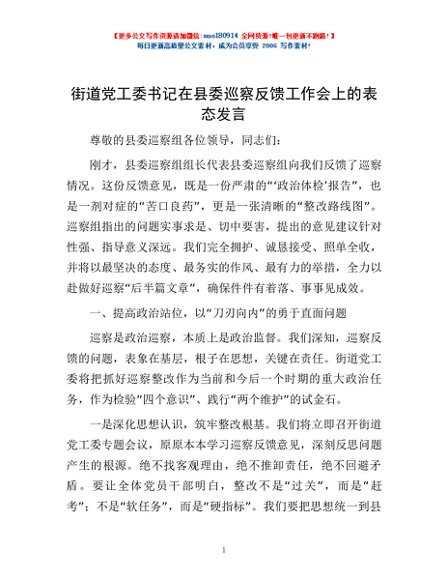 / 街道党工委书记在县委巡察反馈工作会上的表态发言