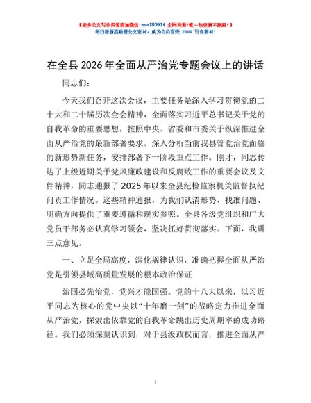 / 在全县2026年全面从严治党专题会议上的讲话