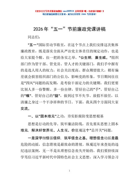 / 2026年“五一”节前廉政党课讲稿