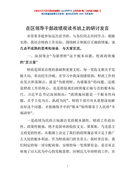 / 在区领导干部政绩观读书班上的研讨发言