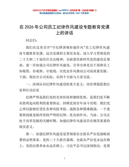 / 在2026年公司员工纪律作风建设专题教育党课上的讲话