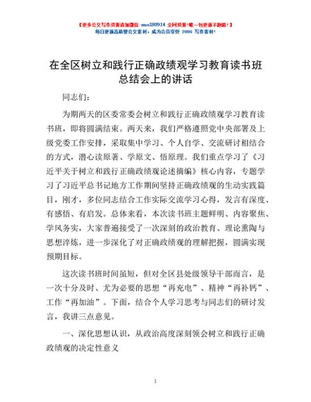 / 在全区树立和践行正确政绩观学习教育读书班总结会上的讲话
