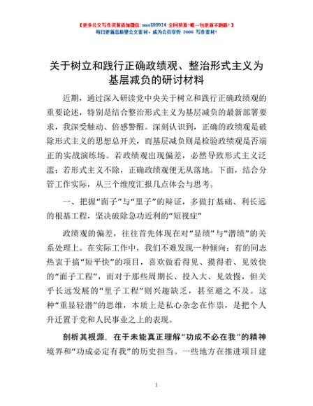 / 关于树立和践行正确政绩观、整治形式主义为基层减负的研讨材料