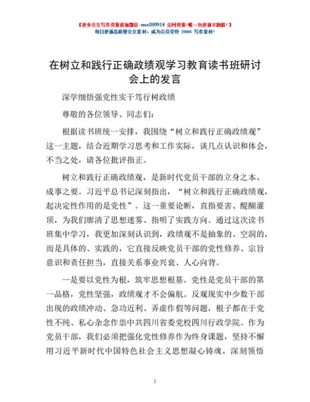 / 在树立和践行正确政绩观学习教育读书班研讨会上的发言