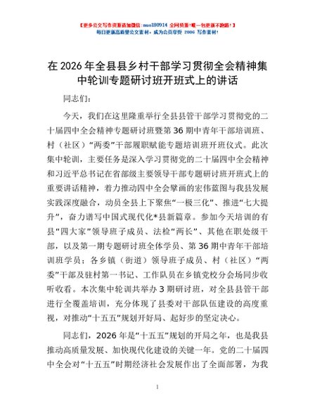 / 在2026年全县县乡村干部学习贯彻全会精神集中轮训专题研讨班开班式上的讲话