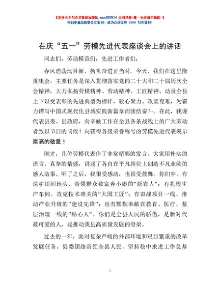 / 在庆“五一”劳模先进代表座谈会上的讲话
