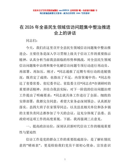 / 在2026年全县民生领域信访问题集中整治推进会上的讲话