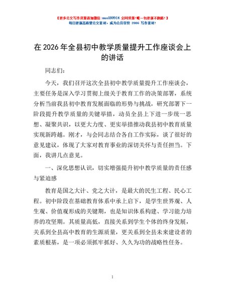 / 在2026年全县初中教学质量提升工作座谈会上的讲话