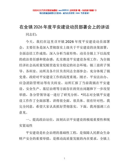 / 在全镇2026年度平安建设动员部署会上的讲话