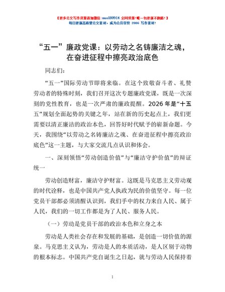/ “五一”廉政党课:以劳动之名铸廉洁之魂,在奋进征程中擦亮政治底色