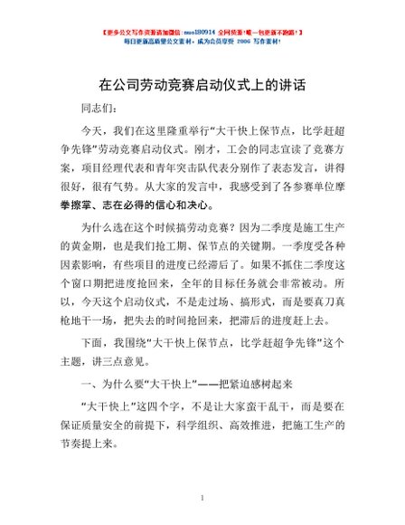 / 在公司劳动竞赛启动仪式上的讲话