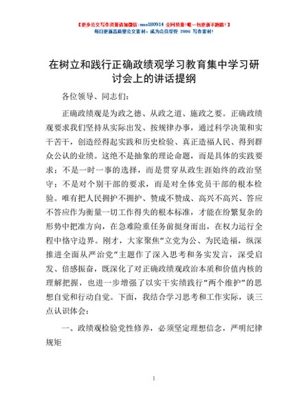 / 在树立和践行正确政绩观学习教育集中学习研讨会上的讲话提纲
