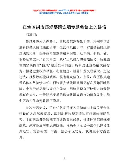 / 在全区纠治违规宴请饮酒专题会议上的讲话