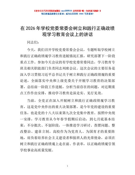 / 在2026年学校党委常委会树立和践行正确政绩观学习教育会议上的讲话