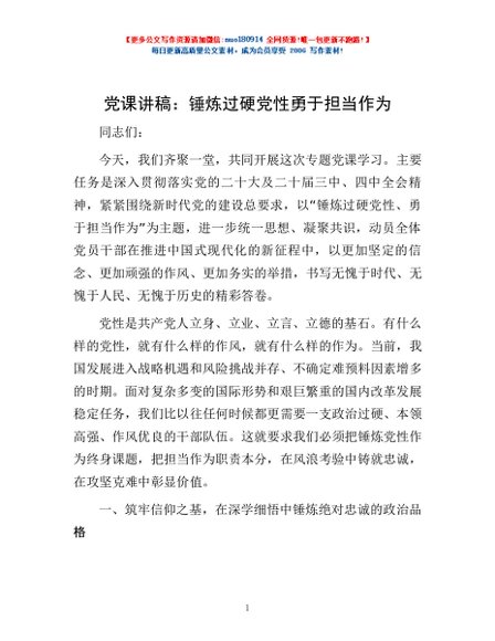 / 党课讲稿:锤炼过硬党性 勇于担当作为