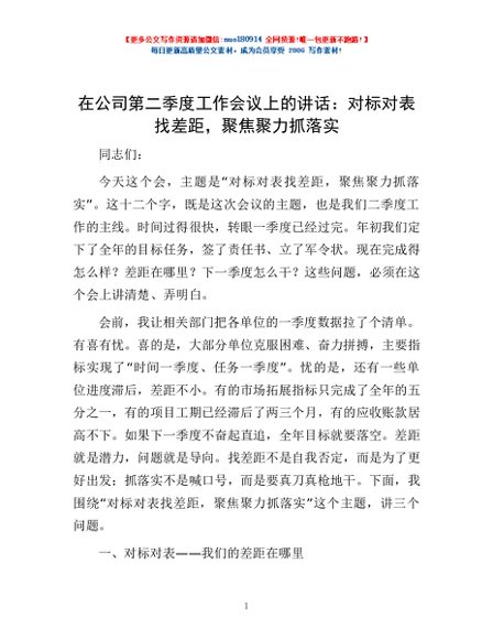 / 在公司第二季度工作会议上的讲话:对标对表找差距,聚焦聚力抓落实