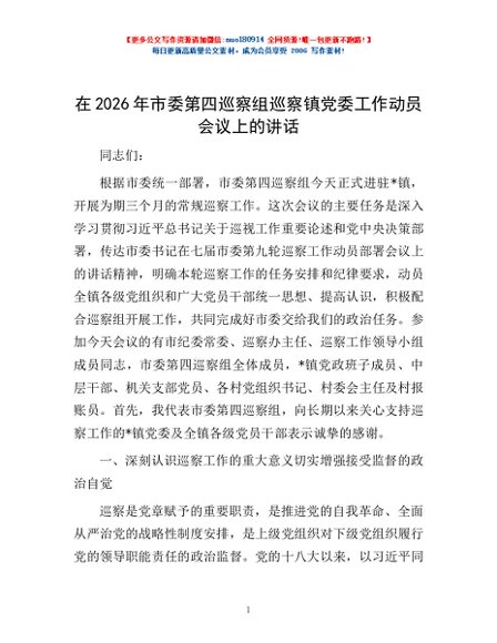 / 在2026年市委第四巡察组巡察镇党委工作动员会议上的讲话