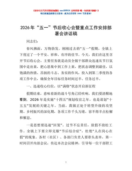 / 2026年“五一”节后收心会暨重点工作安排部署会讲话稿