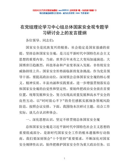 / 在党组理论学习中心组总体国家安全观专题学习研讨会上的发言提纲