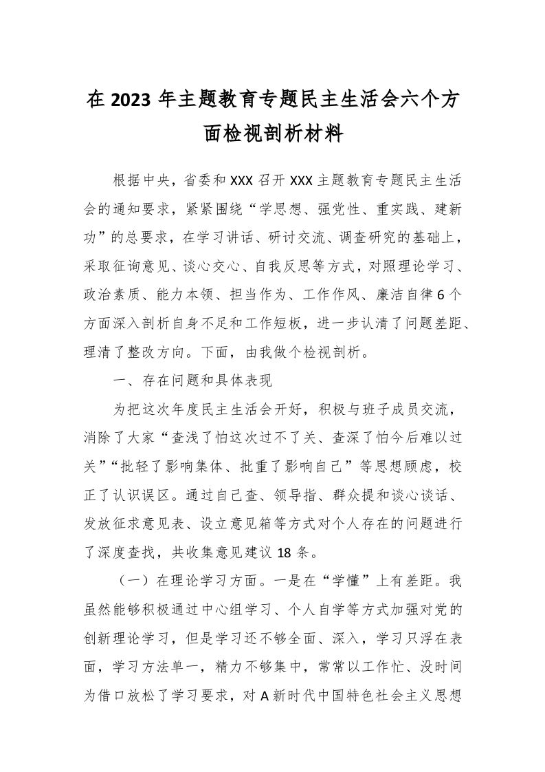 / 在2023年主题教育专题民主生活会六个方面检视剖析材料