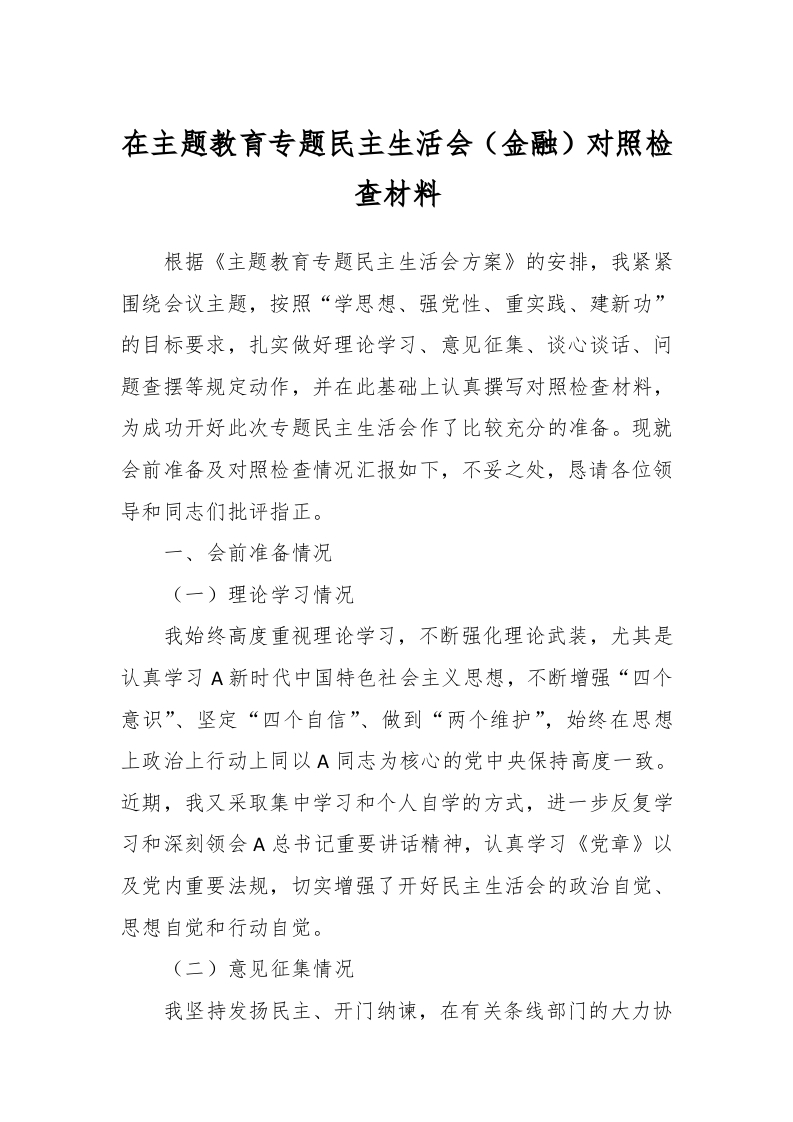 / 在主题教育专题民主生活会(金融)对照检查材料