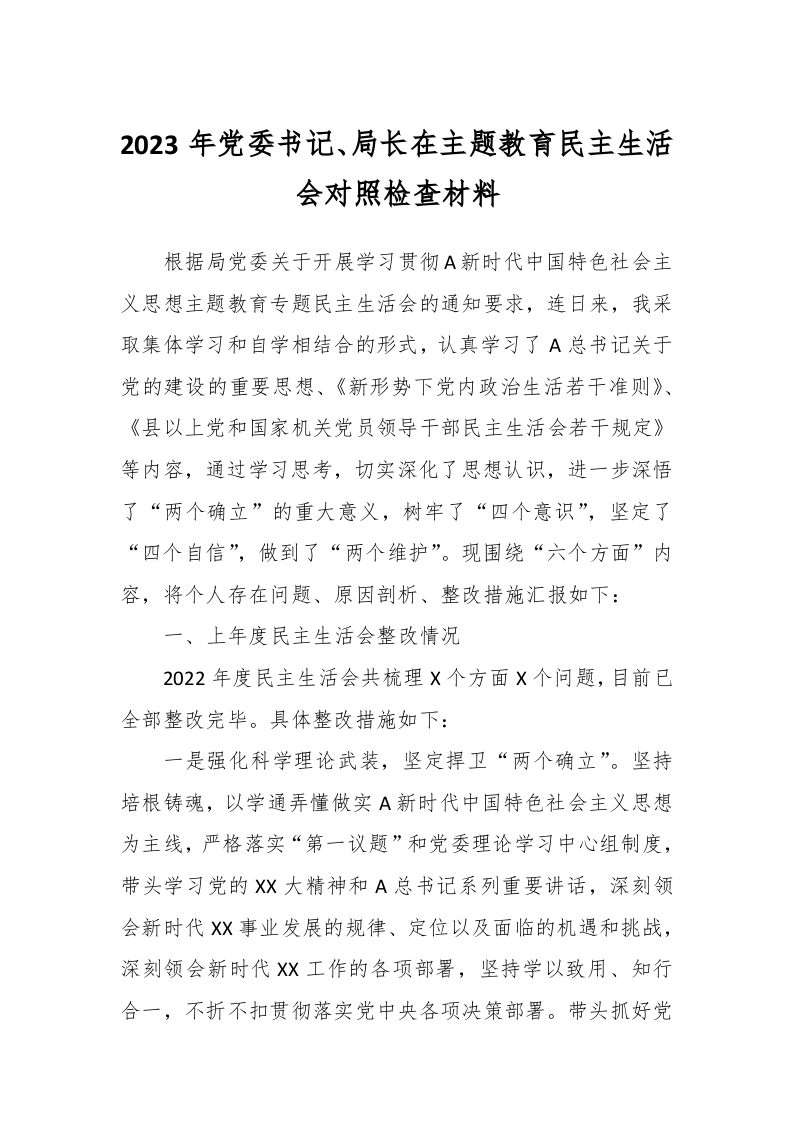 / 2023年党委书记、局长在主题教育民主生活会对照检查材料