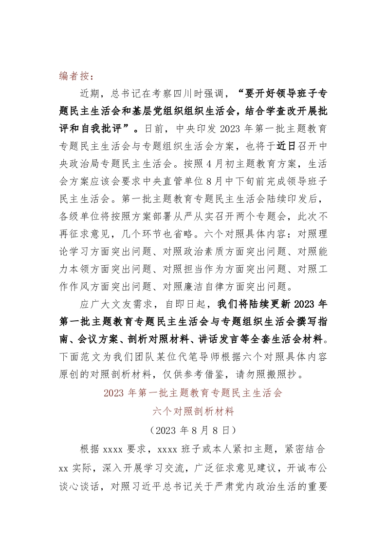 / 2023年第一批主题教育专题民主生活会六个对照剖析材料