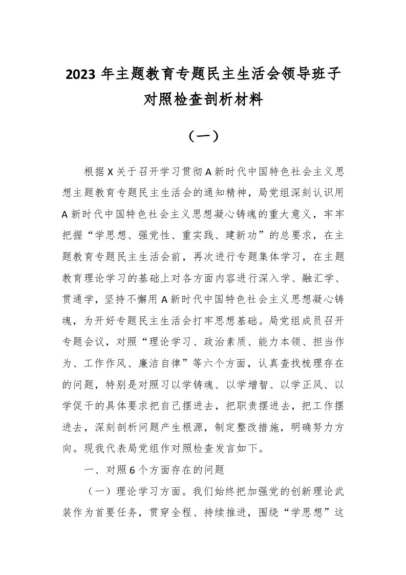 / 2023年主题教育专题民主生活会领导班子对照检查剖析材料(一)