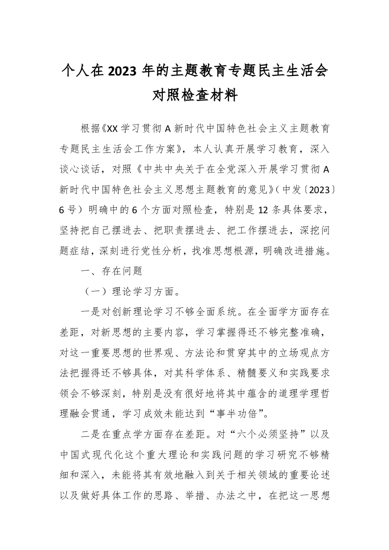 / 个人在2023年的主题教育专题民主生活会对照检查材料