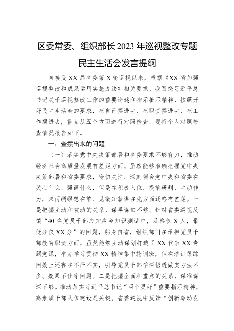 / 区委常委、组织部长2023年巡视整改专题民主生活会发言提纲