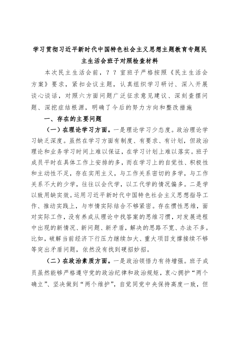 / 学习贯彻习近平新时代中国特色社会主义思想主题教育专题民主生活会班子对照检查材料