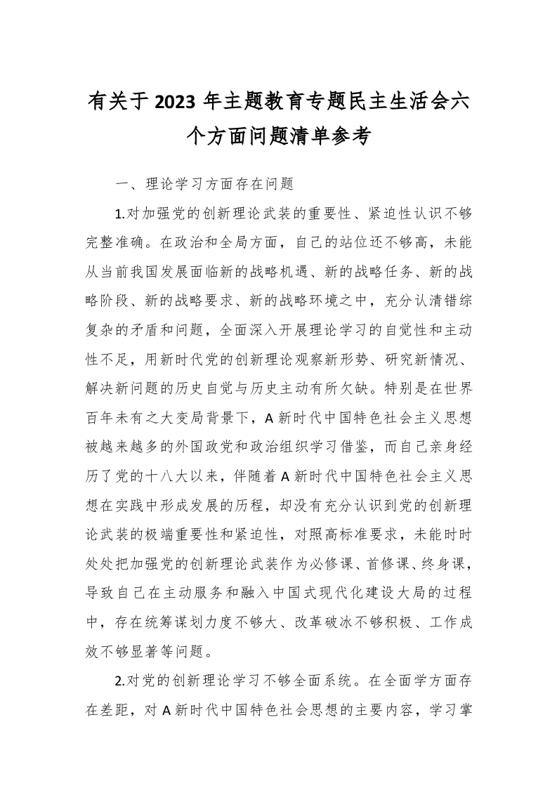 / 有关于2023年主题教育专题民主生活会六个方面问题清单参考