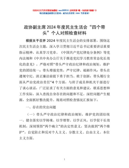 / 政协副主席2024年度民主生活会“四个带头”个人对照检查材料