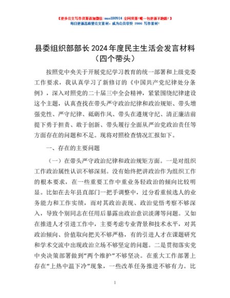 / 县委组织部部长2024年度民主生活会发言材料(四个带头)