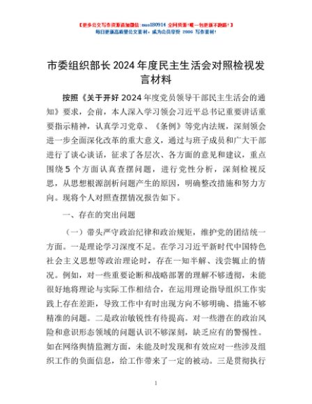 / 市委组织部长2024年度民主生活会对照检视发言材料