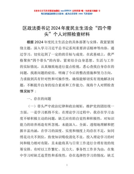 / 区政法委书记2024年度民主生活会“四个带头”个人对照检查材料