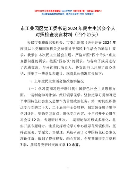 / 市工业园区党工委书记2024年民主生活会个人对照检查发言材料(四个带头)