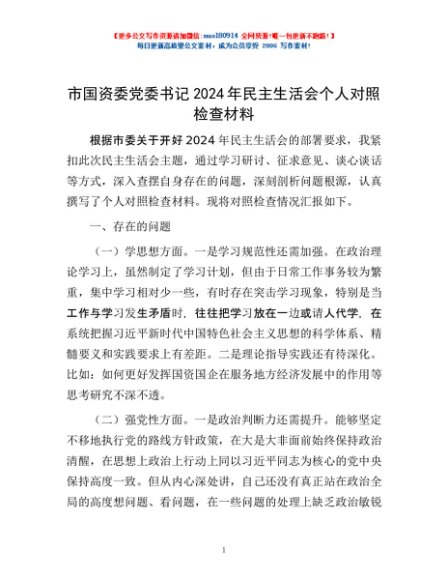 / 市国资委党委书记2024年民主生活会个人对照检查材料