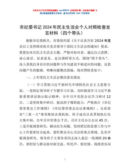/ 市纪委书记2024年民主生活会个人对照检查发言材料(四个带头)