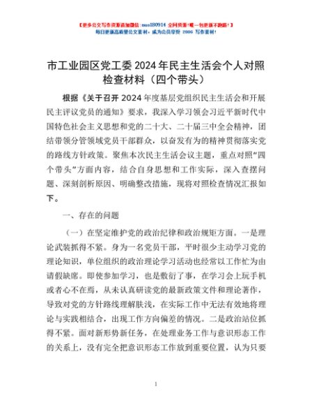 / 市工业园区党工委2024年民主生活会个人对照检查材料(四个带头)
