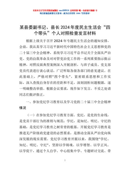 / 某县委副书记、县长2024年度民主生活会“四个带头”个人对照检查发言材料
