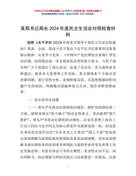/ 某局书记局长2024年度民主生活会对照检查材料