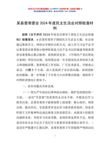 / 某县委常委会2024年度民主生活会对照检查材料