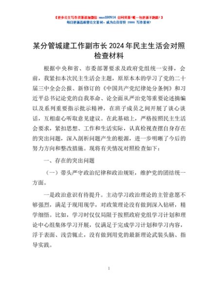 / 某分管城建工作副市长2024年民主生活会对照检查材料