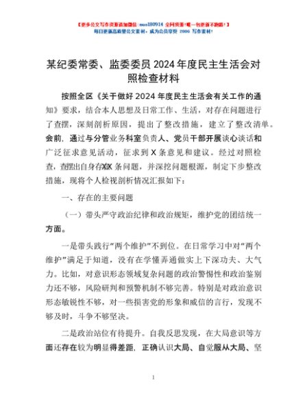 / 某纪委常委、监委委员2024年度民主生活会对照检查材料