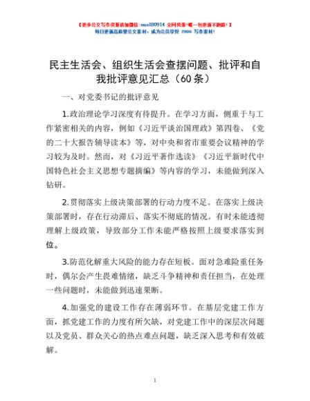 / 民主生活会、组织生活会查摆问题、批评和自我批评意见汇总(60条)