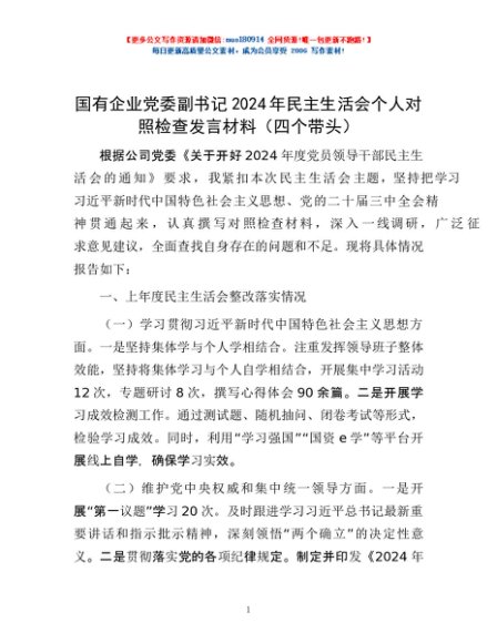 / 国有企业党委副书记2024年民主生活会个人对照检查发言材料(四个带头)