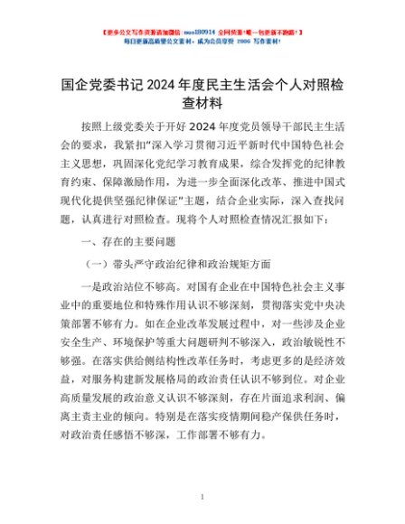 / 国企党委书记2024年度民主生活会个人对照检查材料