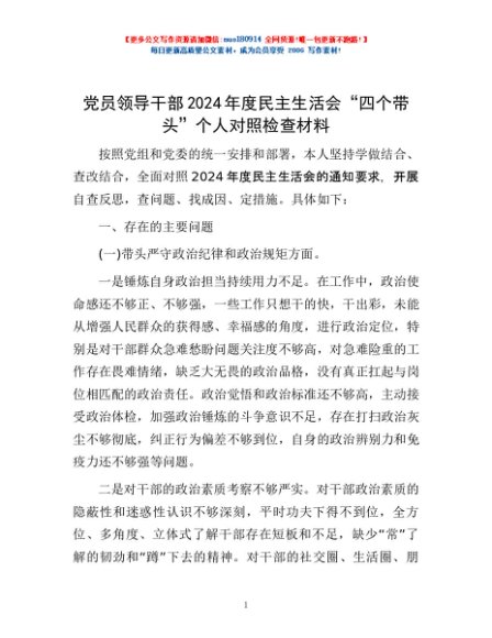 / 党员领导干部2024年度民主生活会“四个带头”个人对照检查材料